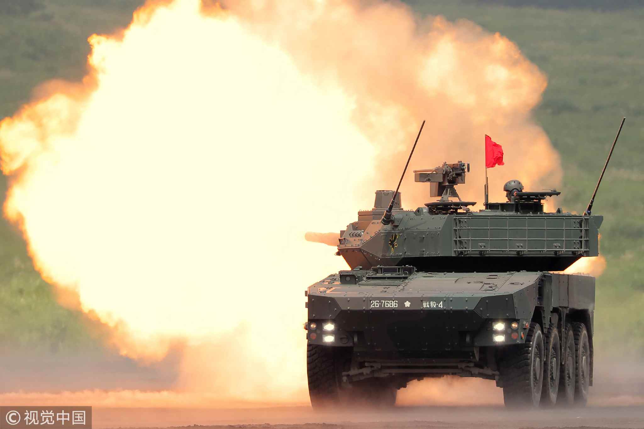 A Japan Ground Self-Defense Forces type-16 mobile combat vehicle fires during an annual live fire military exercise at the Higashi-Fuji firing range in Gotemba, at the foot of Mount Fuji in Shizuoka prefecture, on August 26, 2018. /VCG Photo