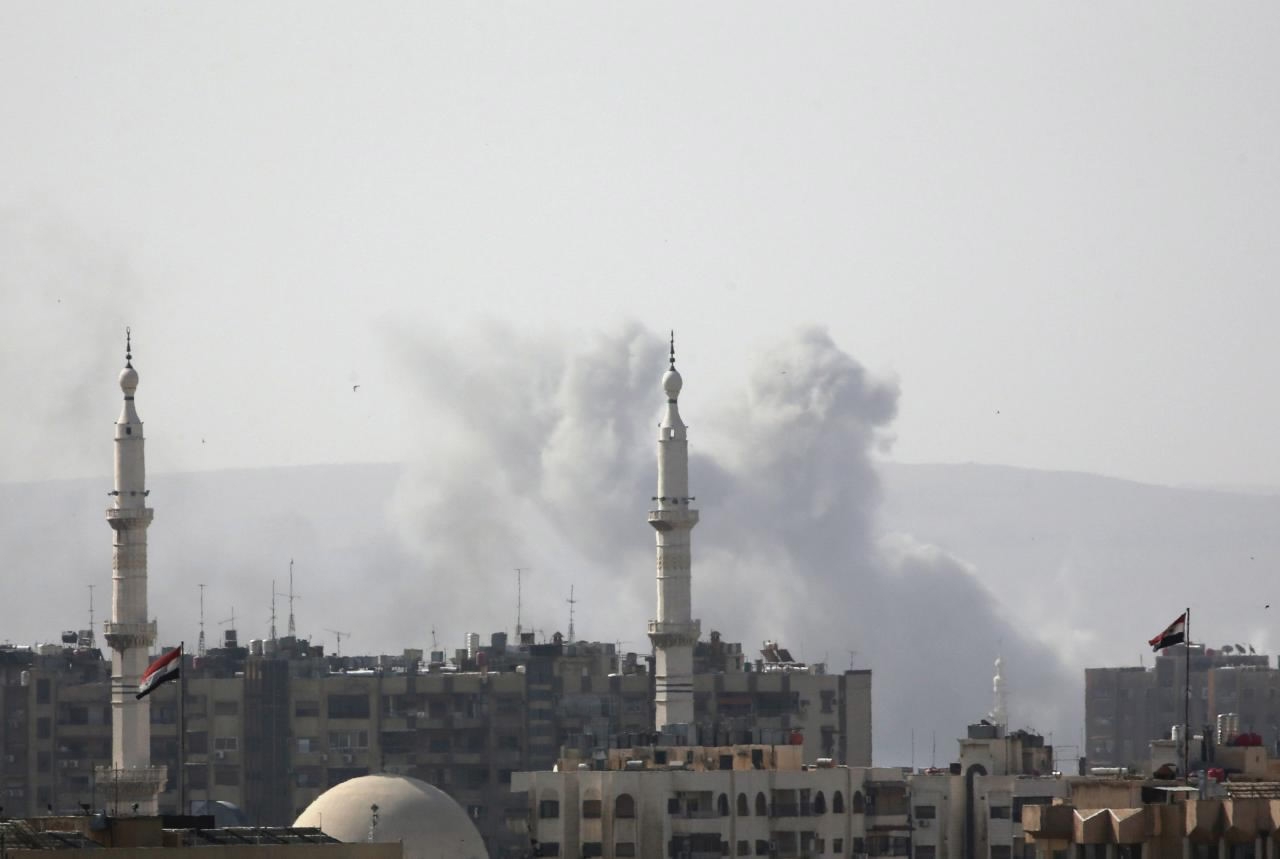 State TV footage showed clouds of smoke rising from the al-Hajar al-Aswad district, part of an enclave including the Palestinian Yarmouk camp that is held by ISIL militants and other jihadist groups.