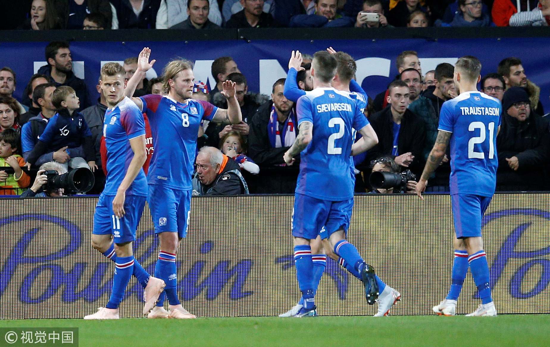 Iceland's midfielder Birkir Bjarnason (2nd, L) celebrates with teammates after scoring a goal during the match between France and Iceland on October 11, 2018. /VCG Photo