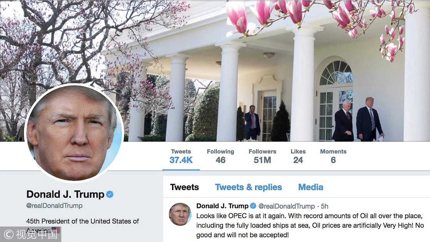 The masthead of US President Donald Trump's @realDonaldTrump Twitter account with a message about OPEC policy is seen on April 20, 2018. /VCG Photo
