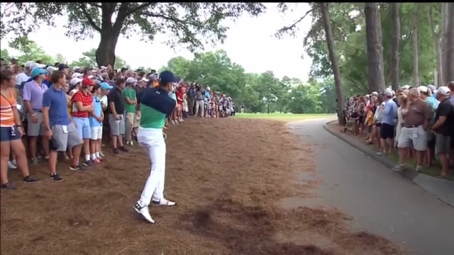 The weather also a factor in the round, as those clouds would bring rain affecting the session. The wet stuff not to blame for this errant tee shot by Rory Mcllroy, as he ends up on the cart path on 10, but the Northern Irishman is able to get it back near the green. He is 10 off the pace. Jordan Spieth going for the career grand slam, has issues as well, also finding trouble on 10 -- his shot would end up nowhere near the fairway -- and spectators flock to the ball's landing spot, to help him locate it. He is 11 back of the leader.