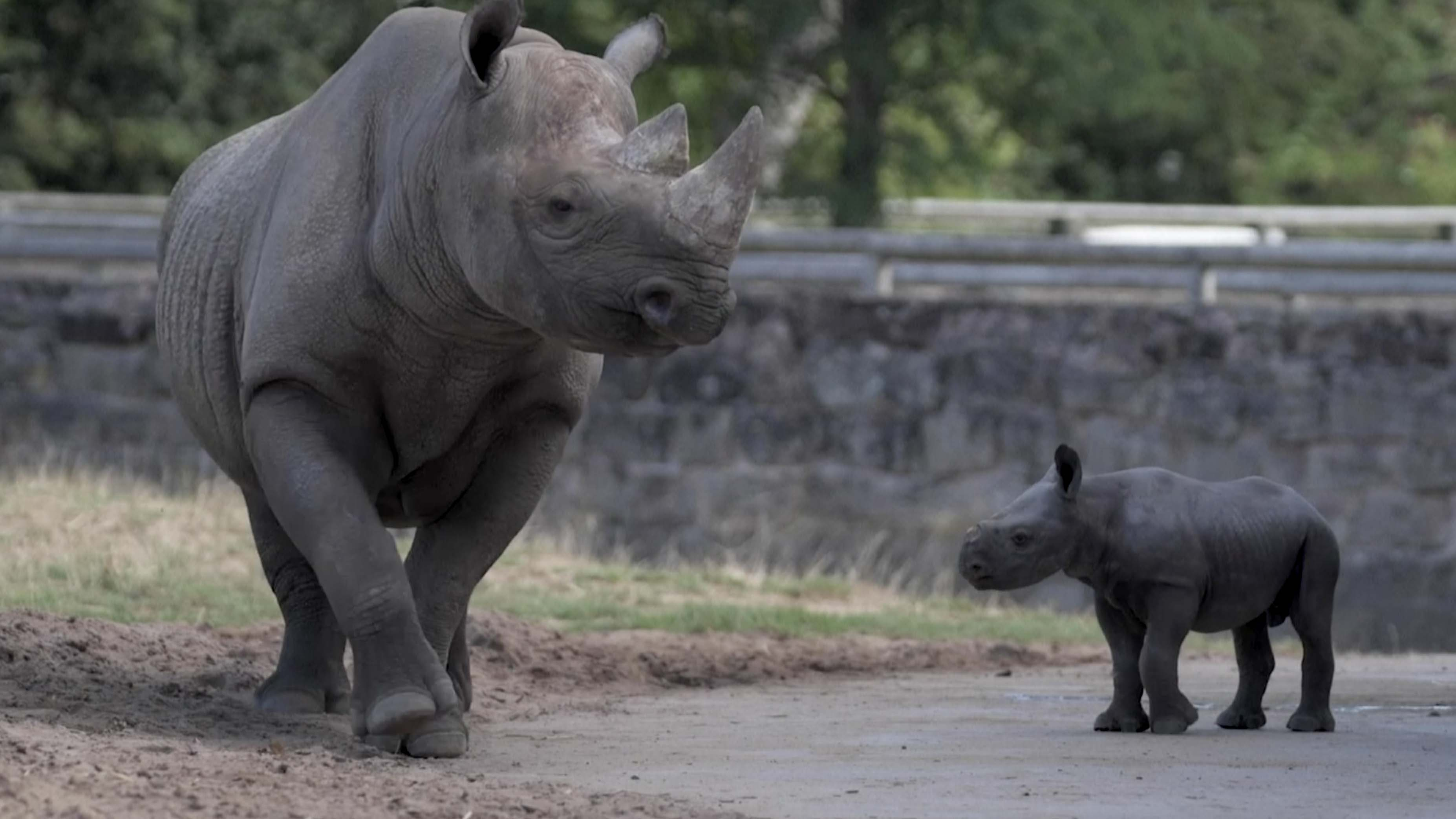 An endangered baby rhino born at Chester Zoo in the UK was seen playing outside on Wednesday for the first time since its birth.