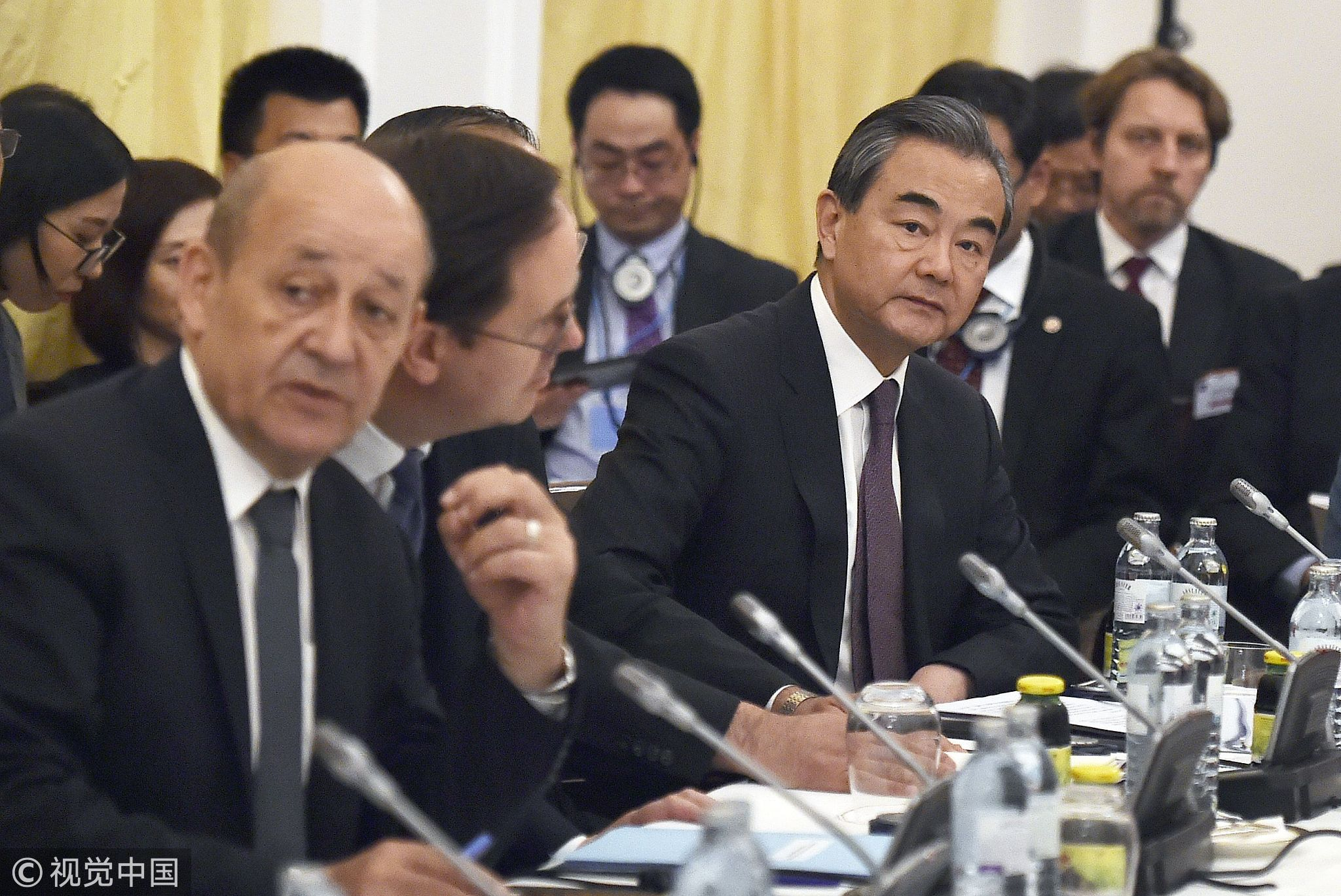 Chinese State Councilor and Foreign Minister Wang Yi (R) takes part in a ministerial meeting on the Iran nuclear deal on July 6, 2018, in Vienna, Austria. /VCG Photo