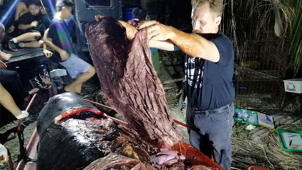 Harrowing footage shows 40kg of plastic being pulled from a whale's stomach after it was found dead on the shores of Compostela Valley in the Philippines on March 16.