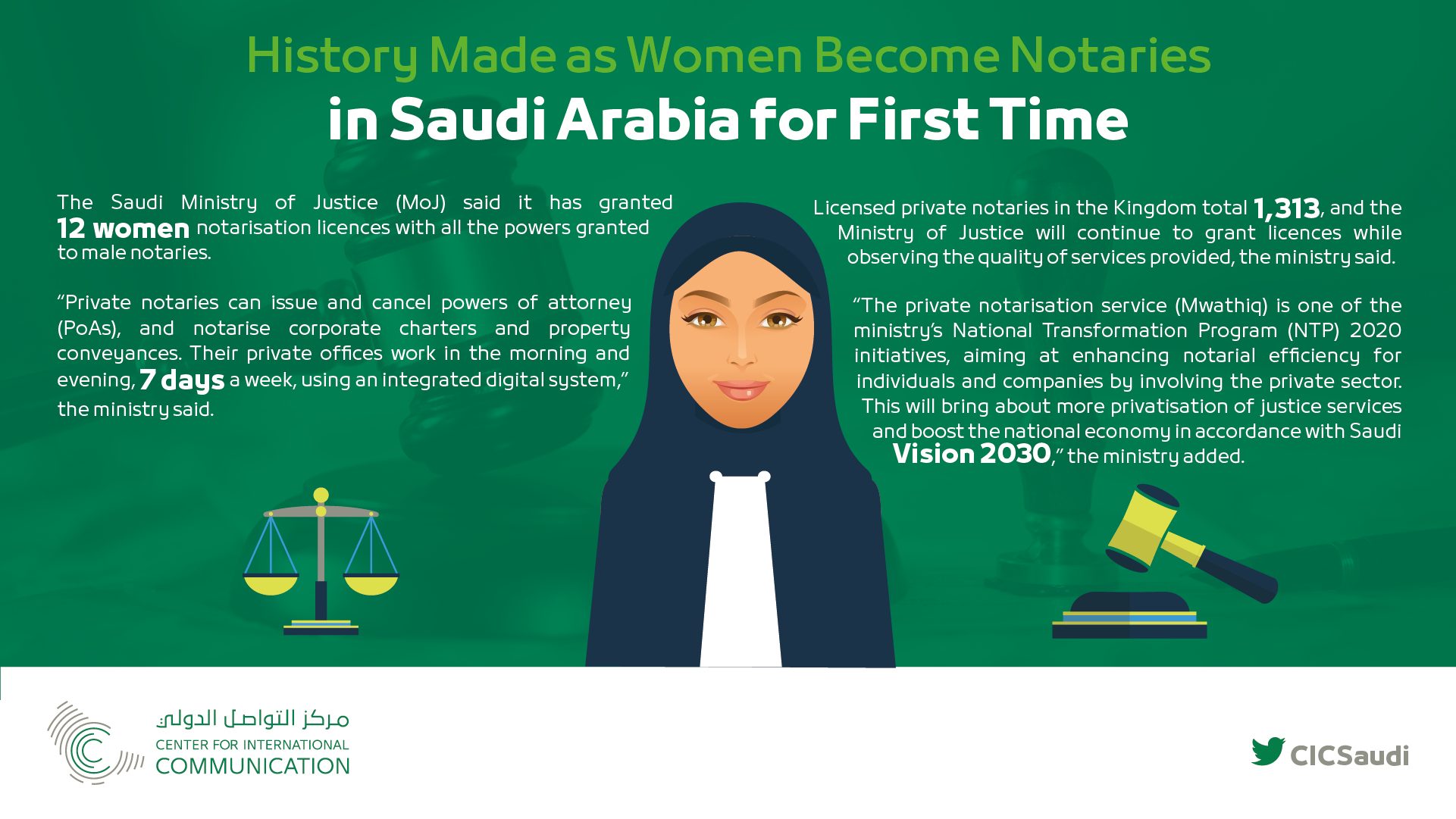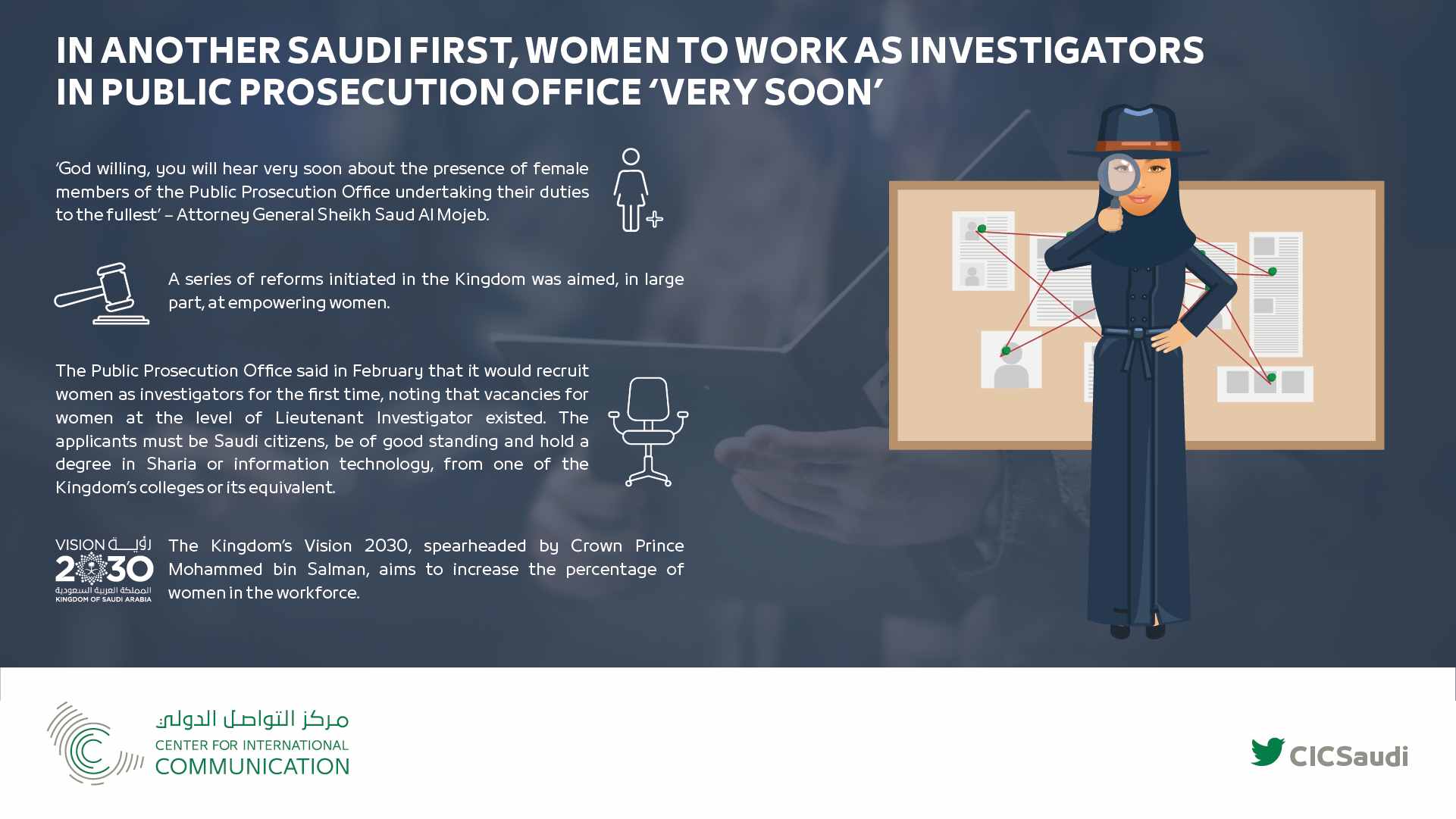 The Saudi Ministry of Justice last month granted notarization licenses to 12 women for the first time making them at par with male notaries. Subsequently Saudi Attorney General Sheikh Saud Al Mojeb announced that women will start working as investigators at the Public Prosecution Office “very soon”.