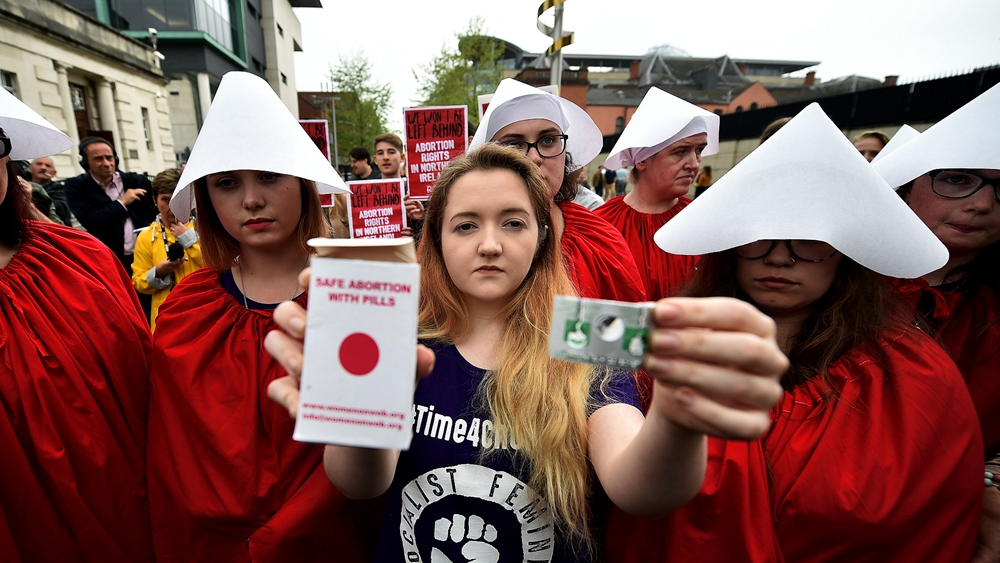 Pro choice activists take part in the Rally for Choice demonstration at Belfast City Hall in Belfast, Northern Ireland, July 7, 2018. Abortion laws in Northern Ireland differ greatly to the rest of the UK and abortion is only available to women in very specific circumstances. /VCG Photo