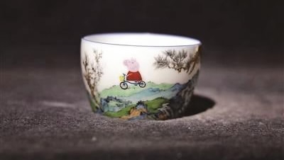 The cup, featuring blue, green and celadon colors, shows Peppa Pig riding a bicycle through grasslands. Many people link it with Qing Dynasty porcelain, which is famous for its delicately painted landscapes and multicolored enamel designs.