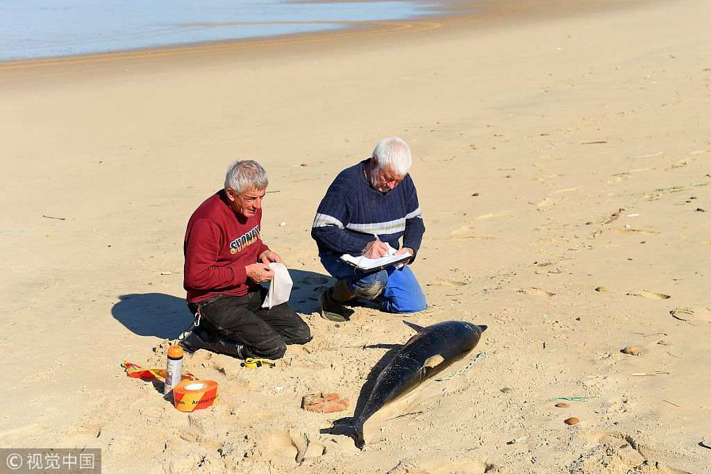 Volunteers of the Pelagis Observatory examine a dead dolphin on a beach of the Atlantic Ocean near Lacanau, southwestern France. /VCG Photo