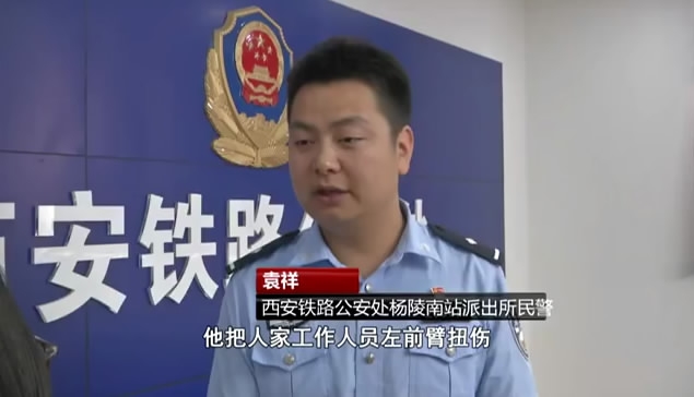 A local police officer said the man injured a staffer by twisting her arm. /CGTN screenshot of the video