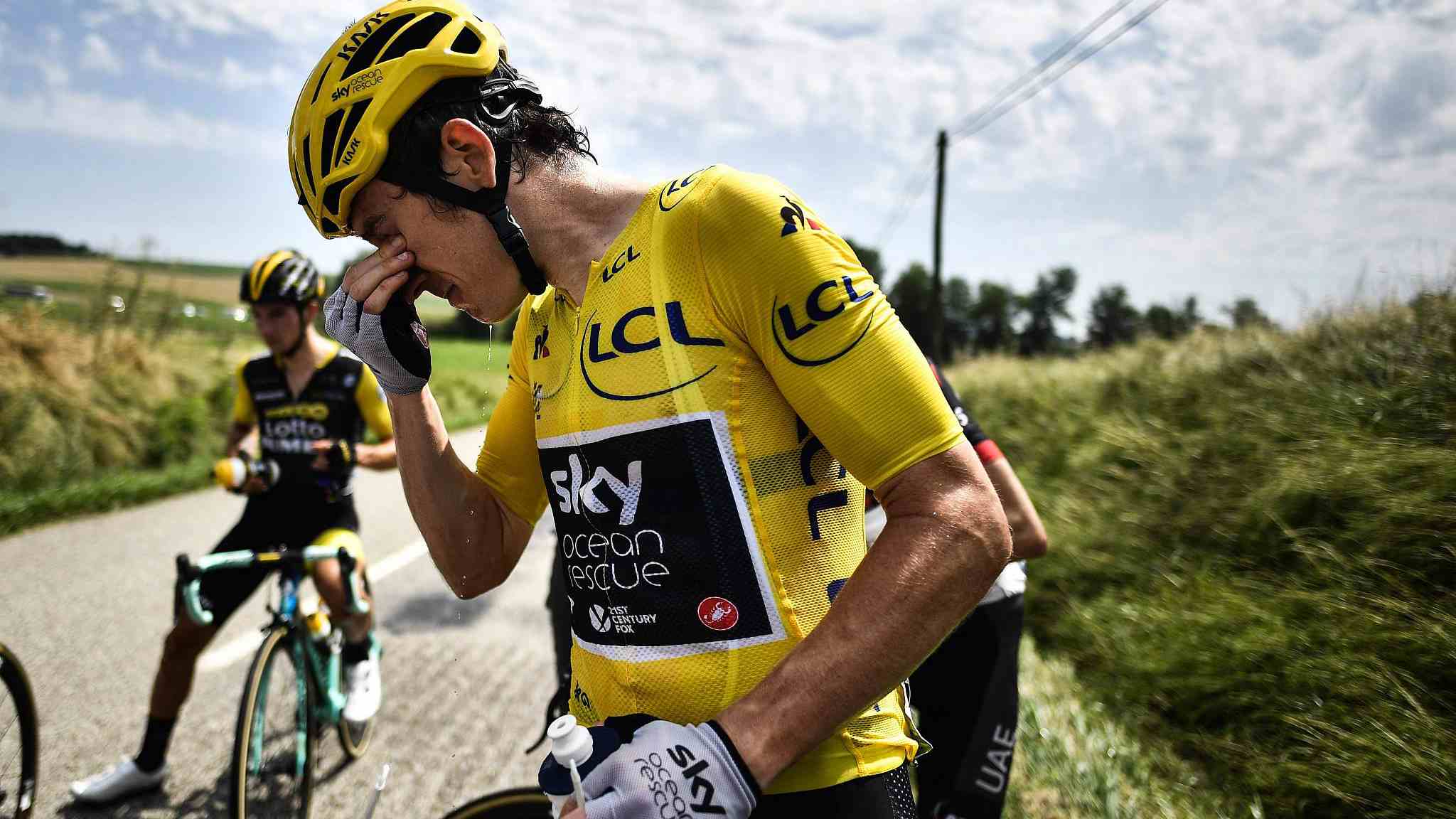Race leader Thomas, of Team Sky, was one of several riders forced to clean his eyes and throat with water, although the Welshman said he was "okay in the end."