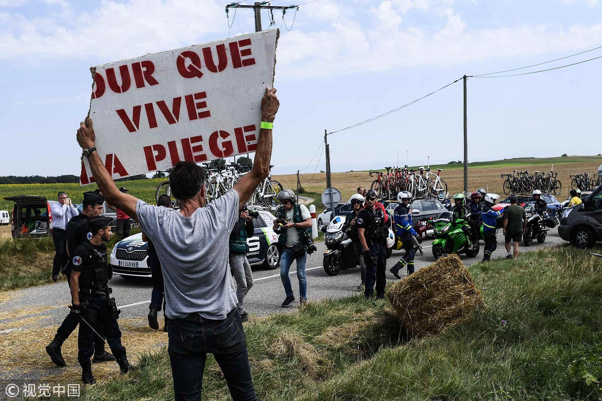 A protester holds a placard reading "For the Piege region to live" as gendarmes stand watch (Rear) during a farmers' protest who attempted to block the stage's route during the 16th stage between Carcassonne and Bagneres-de-Luchon, southwestern France. /VCG Photo
