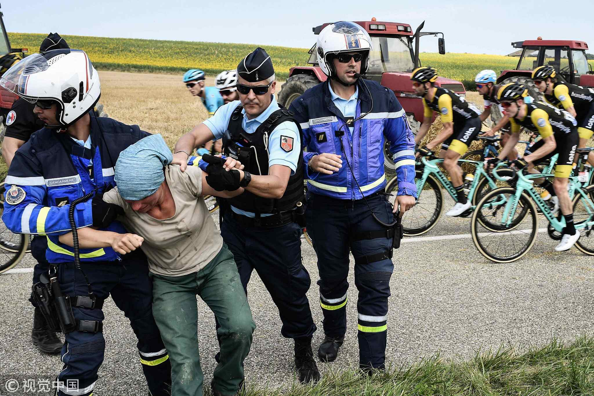 Gendarmes hold back a protester as the pack rides behind, during a farmers' protest that attempted to block the stage's route. /VCG Photo