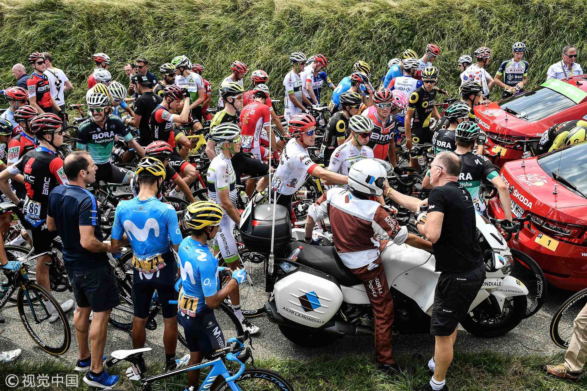 The race was halted for several minutes after tear gas was used as protesting farmers attempted to block the route during the 16th stage, July 24, 2018. /VCG Photo