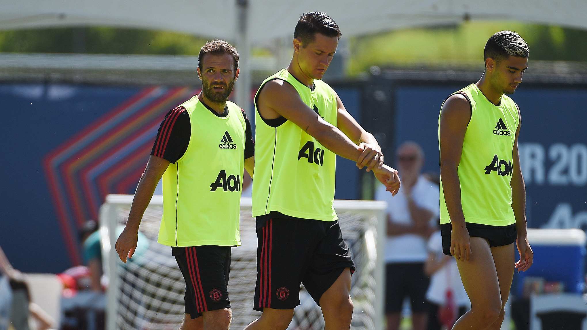 Juan Mata (L) Ander Herrera (C) and Andreas Pereira of Manchester United during a pre-season training at UCLA on July 24, 2018 in Los Angeles, California. /VCG Photo