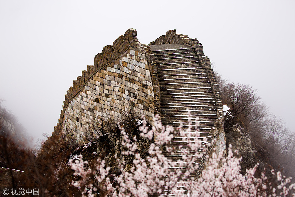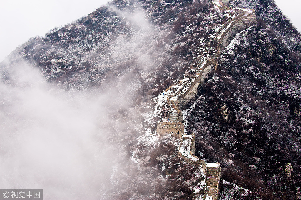 As the temperature in Beijing went through a sharp drop recently, the Jiankou section of the Great Wall in north Beijing was covered with snow on Tuesday. /VCG Photo