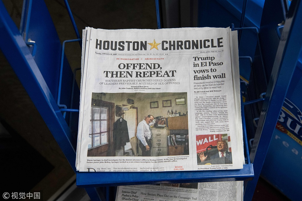 The front page of the Houston Chronicle features a story on accusations of abuse in Southern Baptist churches at a gas station in Houston, Texas, February 12, 2019. /VCG Photo