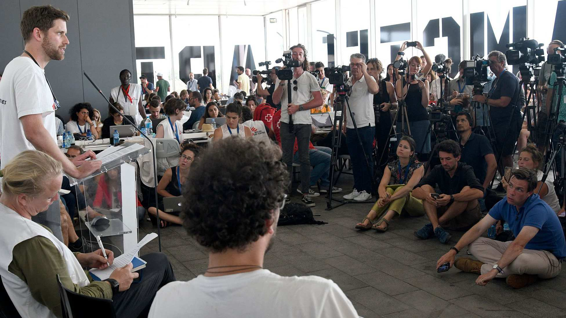 David Beversluis (L), Doctors Without Borders (MSF) doctor, gives a press conference after the arrival of the Aquarius rescue ship, operated by SOS Mediterranee and Doctors Without Borders, on June 17, 2018 in Valencia. The 630 migrants whose rescue sparked a major migration row in Europe arrived in Spain after a turbulent week that saw Italy and Malta turn them away. /VCG Photo