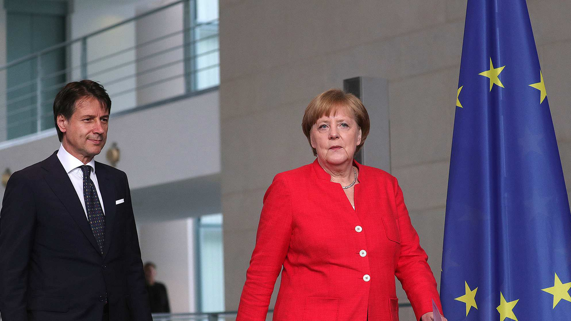 Giuseppe Conte, Italy's prime minister, left, and Angela Merkel, Germany's chancellor, walk to a press conference at the Chancellery building in Berlin, Germany, June 18, 2018. /VCG Photo