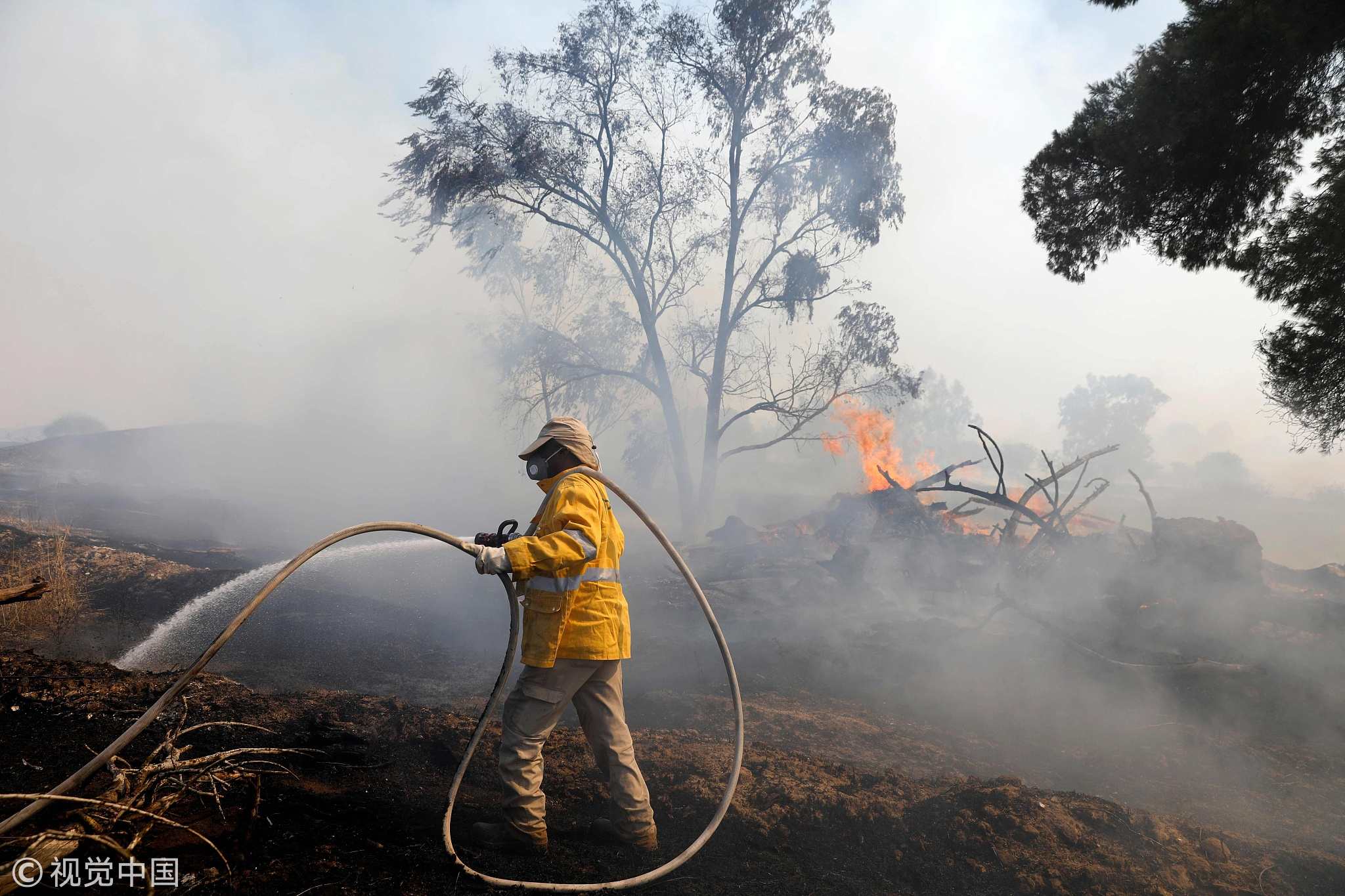 Israeli firefighters attempt to extinguish a fire in a forest near the Kibbutz of Kissufim, alongside the border of the Gaza Strip on June 5, 2018. /VCG Photo
