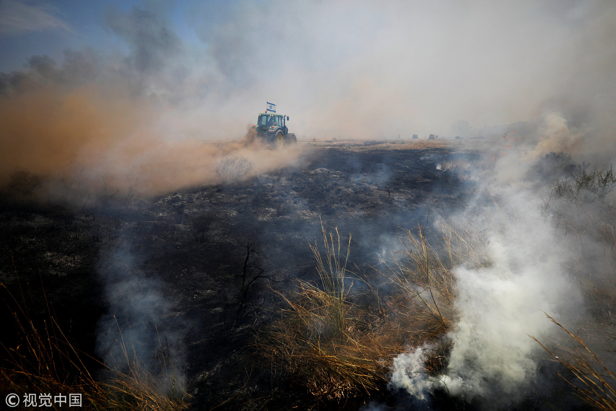 A tractor drives in a smoking field during a fire in an area where Palestinians have been causing blazes by flying kites and balloons loaded with flammable materials, on the Israeli side of the border between Israel and the Gaza Strip, near Kibbutz Nir Am on June 5, 2018. /VCG Photo