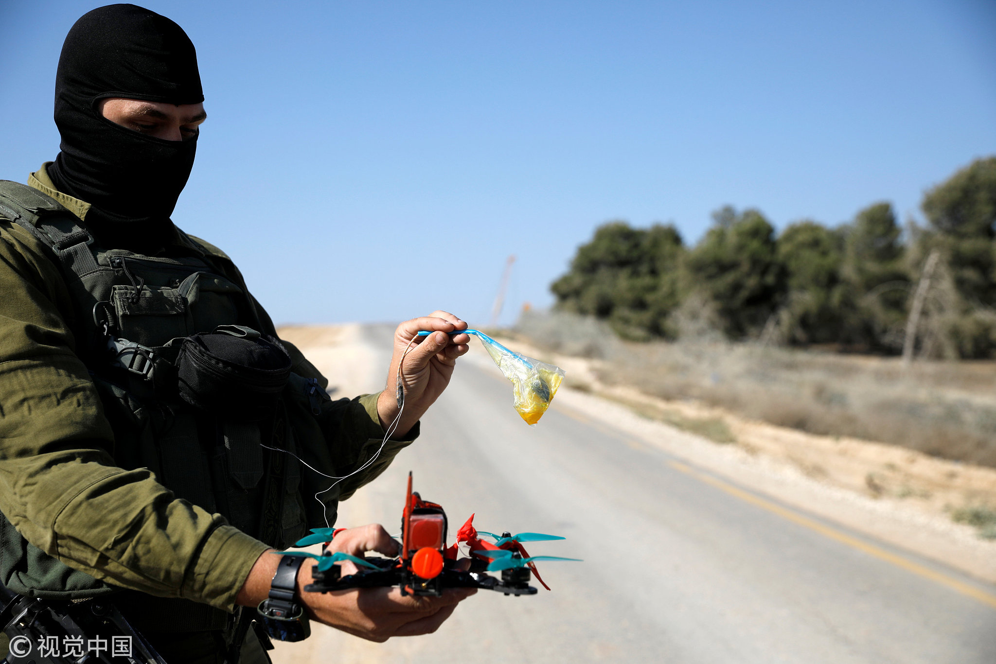 An Israeli soldier shows a drone and a flammable material in a device which was connected to balloons, after it was intercepted by the drone in an area where Palestinians have been causing blazes by flying kites and balloons loaded with flammable materials, on the Israeli side of the border between Israel and the Gaza Strip, near Kissufim, Israel on June 5, 2018. /VCG Photo