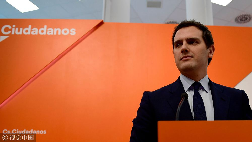 Albert Rivera, leader of the opposition center-right party "Ciudadanos" (Citizens) gives a press conference in Madrid, Spain, May 28, 2018. /VCG Photo