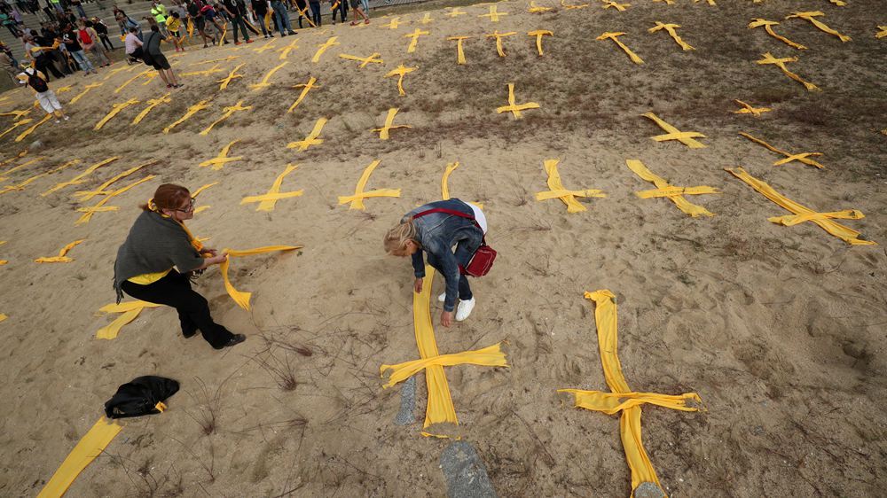 Catalan separatist supporters remove yellow crosses after a protest to demand the release of jailed Catalonian politicians, at Mataro's beach, north of Barcelona, Spain, May 27, 2018. /Reuters Photo
