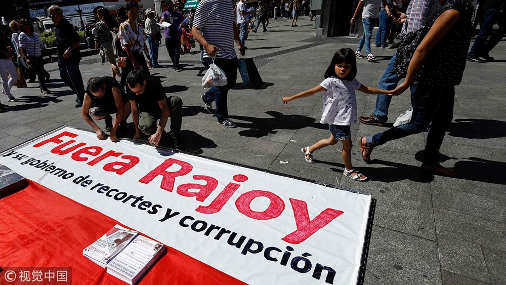 A poster on the gorund reads, "Out Rojoy" during a demonstration calling for vote of no confidence against Spanish Prime Minister Mariano Rajoy in Madrid, Spain, May 20, 2017. /VCG Photo