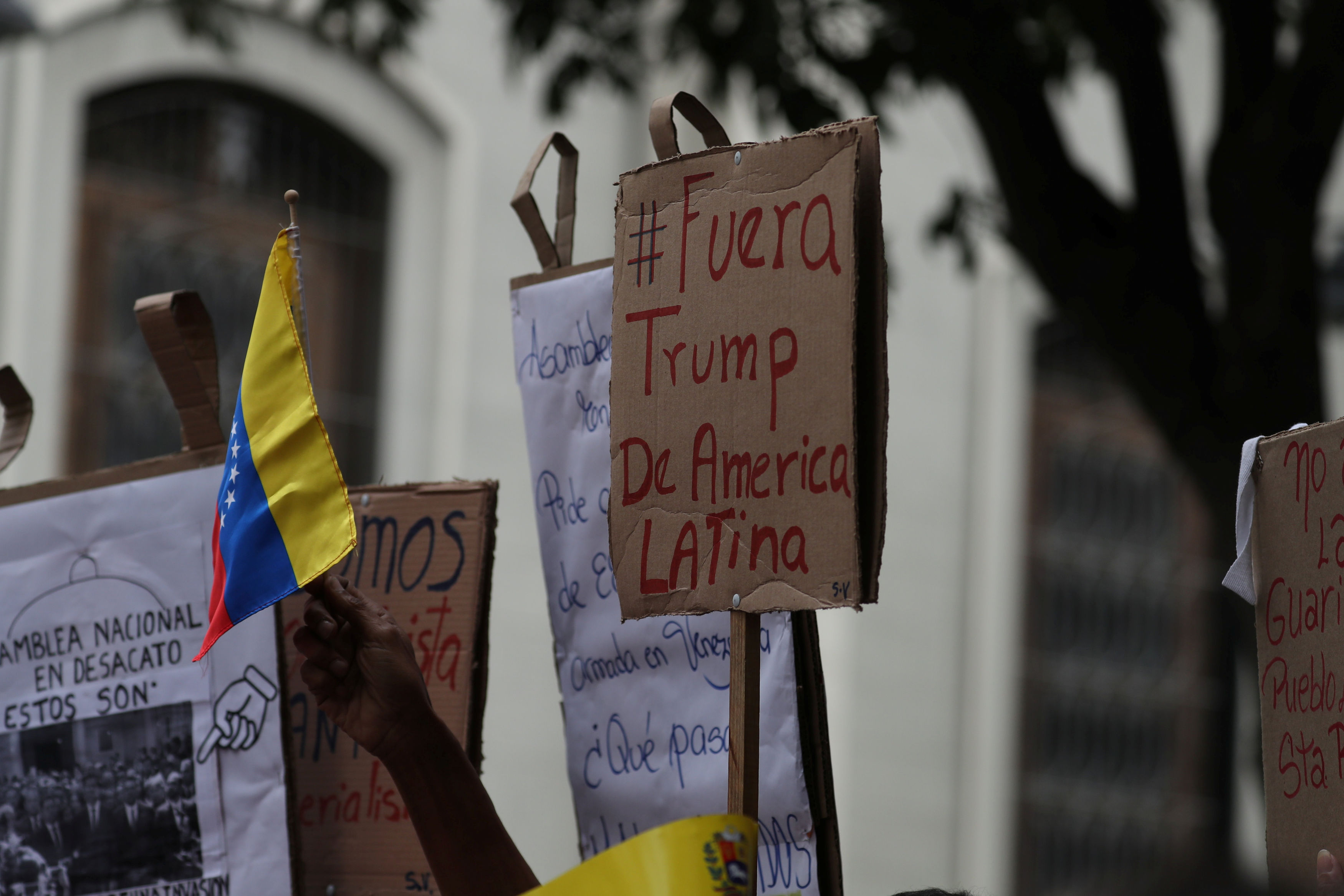 A supporter of Venezuela's President Nicolas Maduro holds up a banner reading 'Out Trump from Latin America' near the National Assembly building in Caracas, Venezuela, May 21, 2019. /Reuters Photo