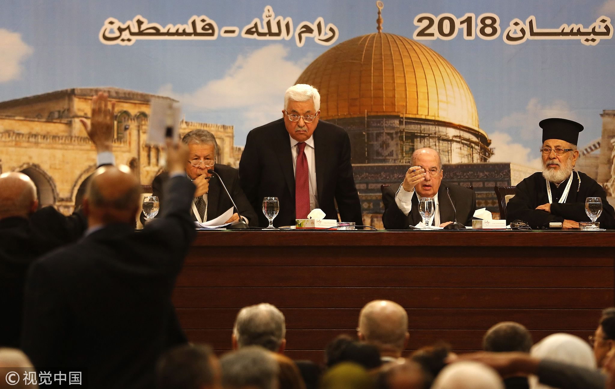 Palestinian President Mahmoud Abbas (C) chairs a Palestinian National Council meeting in Ramallah, April 30, 2018. /VCG Photo