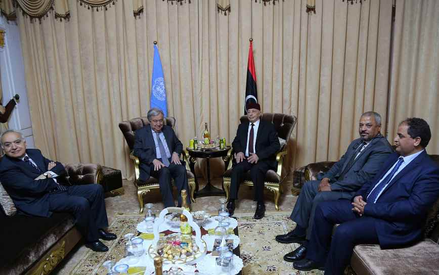 Aguila Saleh, Libya's parliament president, meets Secretary-General of the United Nations Antonio Guterres in Tobruk, April 5, 2019. /VCG Photo