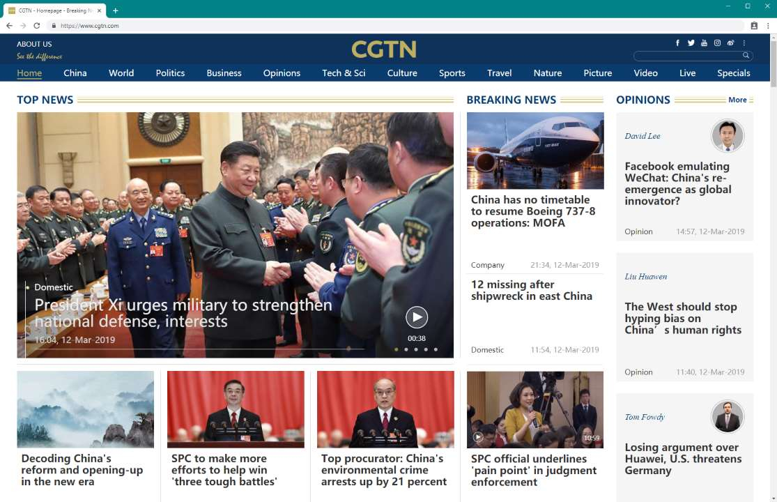 CGTN's offical website opened in a Chrome web browser, retrieved on March 12, 2019. /CGTN Screenshot