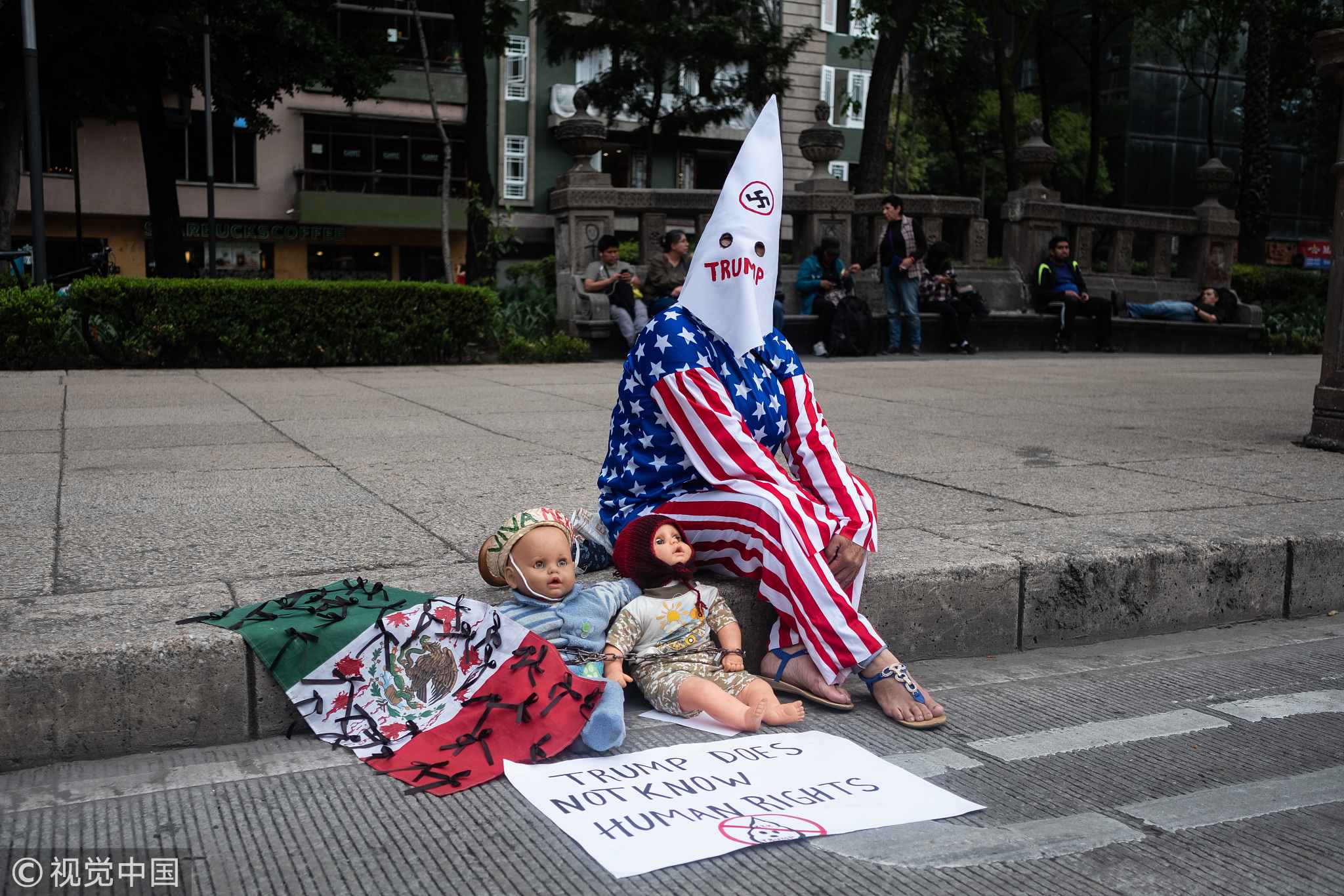 A protester wearing American flag-themed clothing sits on a sidewalk during a 'Families Belong Together' rally outside the US Embassy in Mexico City, Mexico, on Thursday, June 21, 2018. /VCG Photo