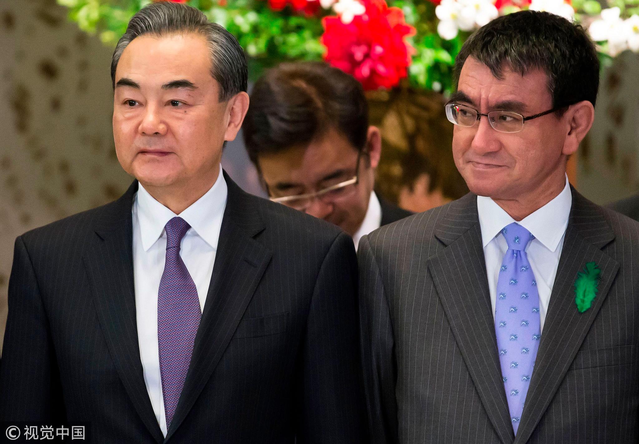 China's Foreign Minister Wang Yi (L) and Japan's Foreign Minister Taro Kono pose during a photo session ahead of a high-level Japan-China economic dialogue in Tokyo on April 16, 2018. /VCG Photo