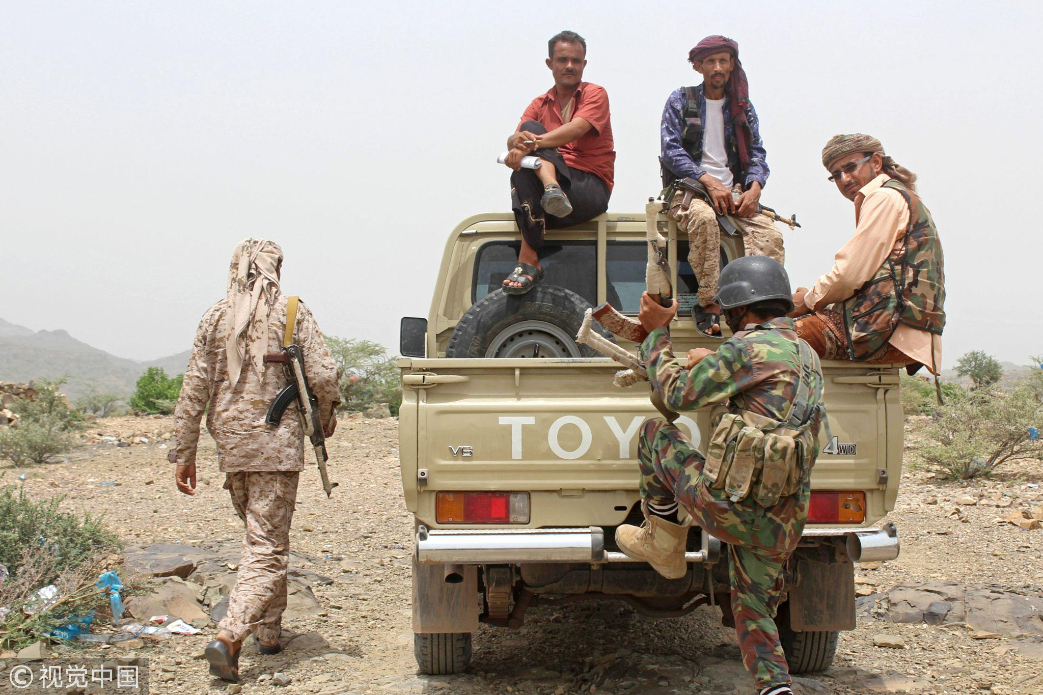 Yemeni pro-government fighters sit at the back of an armed pick-up as Emirati-supported forces take over Houthi bases on the frontline of Kirsh between the province of Taez and Lahj, southwestern Yemen, July 1, 2018. /VCG Photo