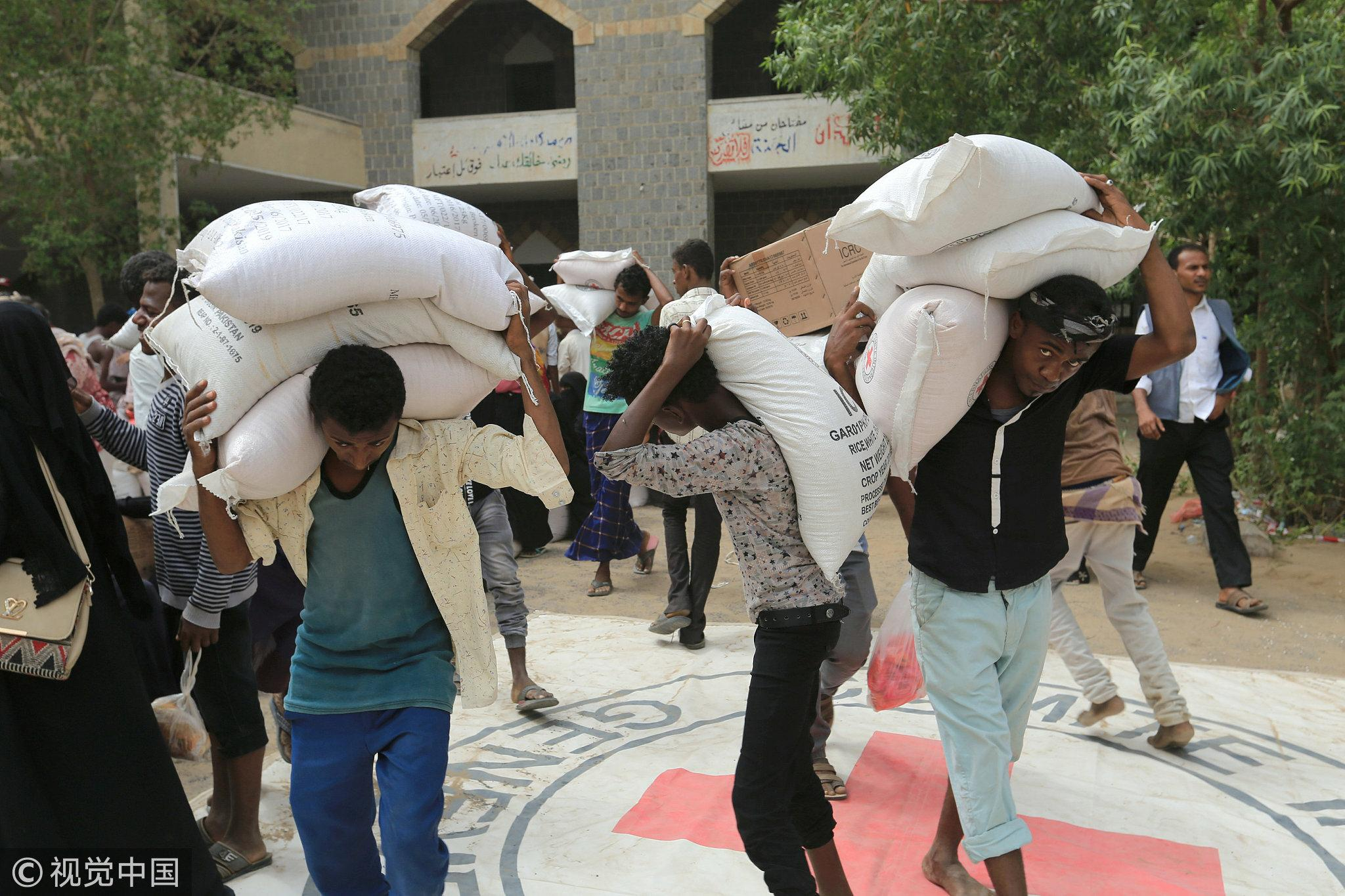 People carry sacks of rice, sugar and beans delivered by the International Committee of the Red Cross to internally displaced people in the Red Sea port city of Hodeidah, Yemen, July 21, 2018. /VCG Photo