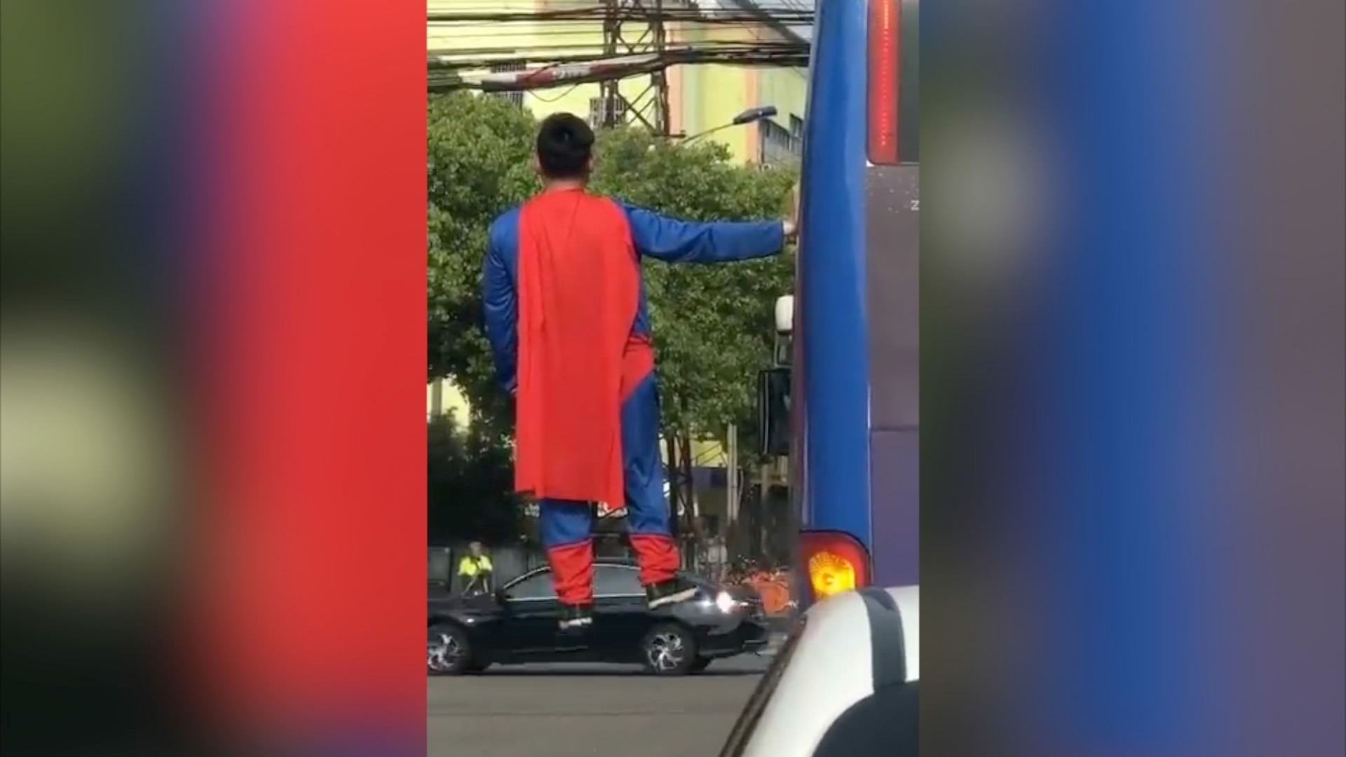 A fake "Superman" was spotted holding onto the side of a bus on a street in China's Suzhou City. A property developer had reportedly created the spectacle to sell houses. However, the bus driver was later fined 200 yuan for breaking traffic safety laws.