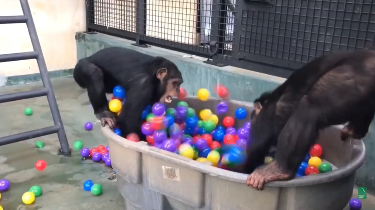 Nine chimpanzees who had been involved in research programs have discovered a new way to enjoy their retirement at a sanctuary in Georgia's Blue Ridge Mountains in the US. Carers at the Project Chimps design activities such as the ball pit adventure to enrich the chimps' lives.