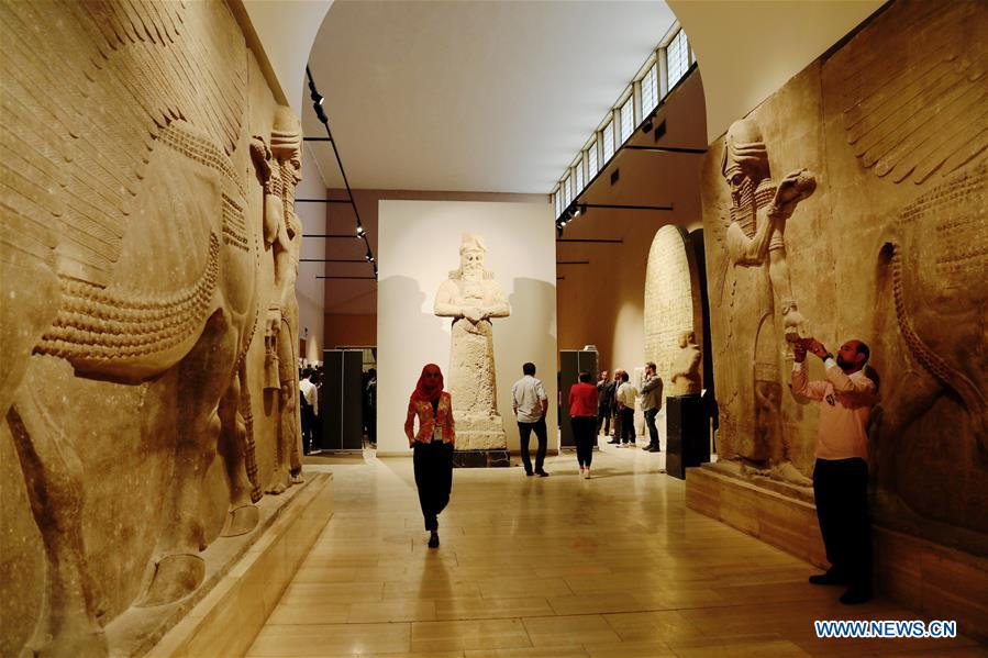 People tour a heritage exhibition at the Assyrian hall of National Museum in Baghdad, Iraq, May 19, 2019. /Xinhua Photo
