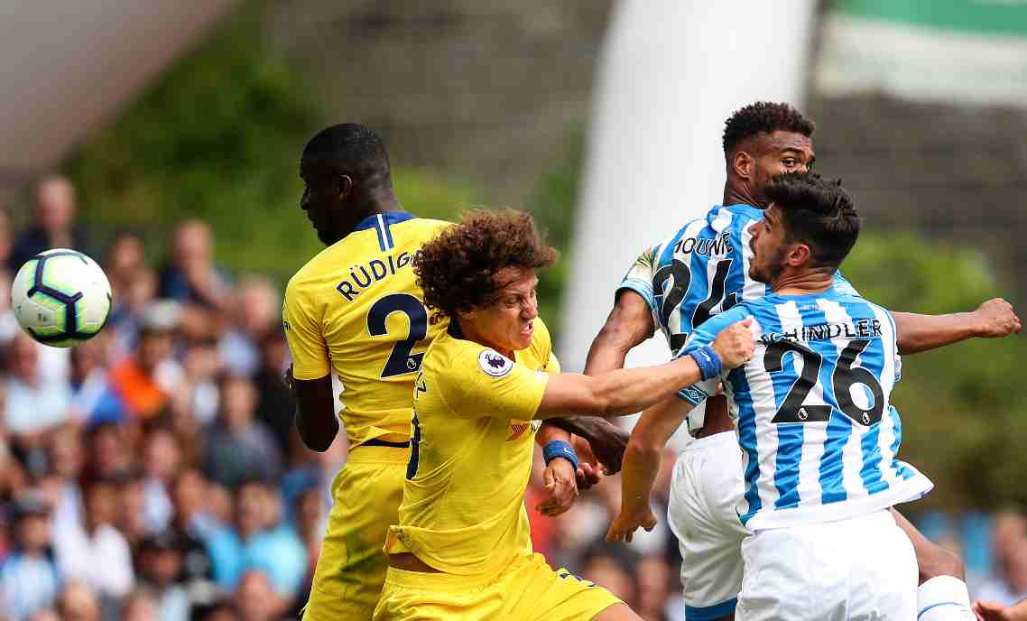 David Luiz and Christopher Schindler tussle during the Premier League match between Huddersfield Town and Chelsea. /VCG Photo