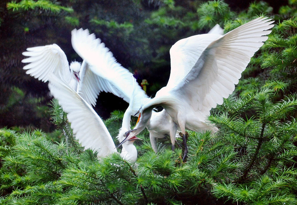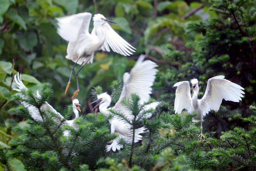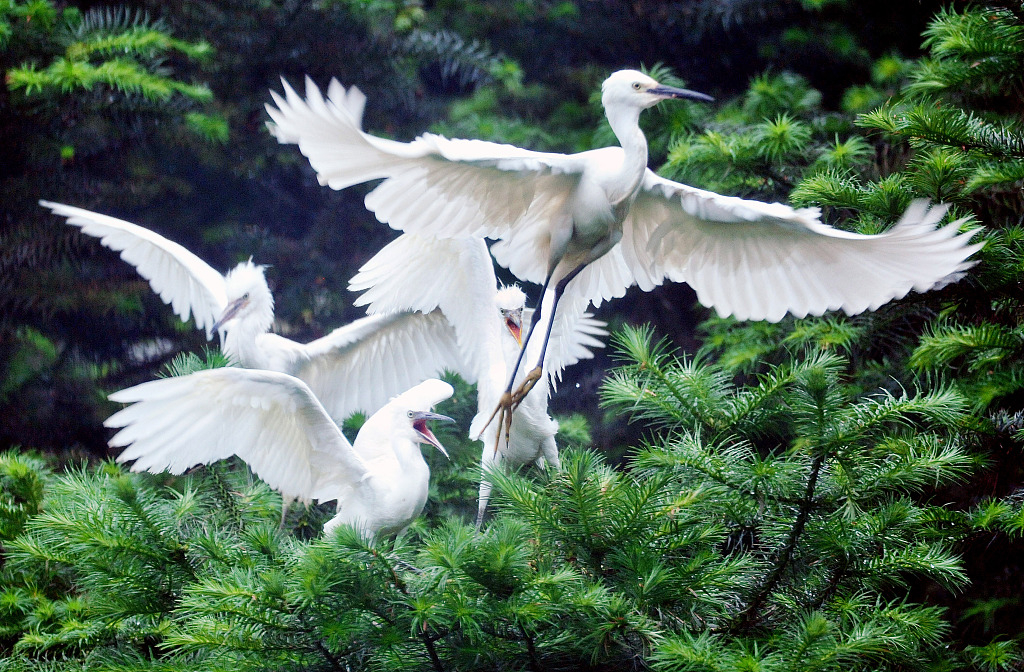Thousands of little egrets have migrated to a mountain in Shangrao, east China's Jiangxi Province for this summer. As the breeding season is approaching, little egrets are busying building their nests. /VCG Photo.