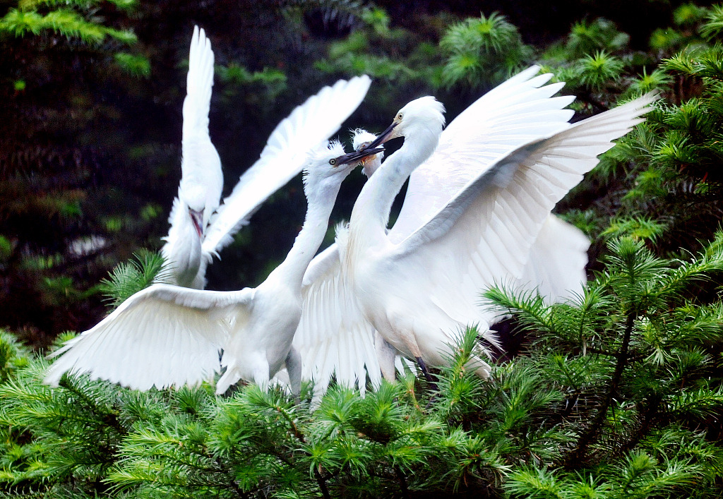 Little egrets' breeding season usually falls from March to July. It is also the best season for people to appreciate the beauty of the animal as their filamentous nuptial plumage could be seen cascade down their back while elaborate mating performances are also on display. /VCG Photo.