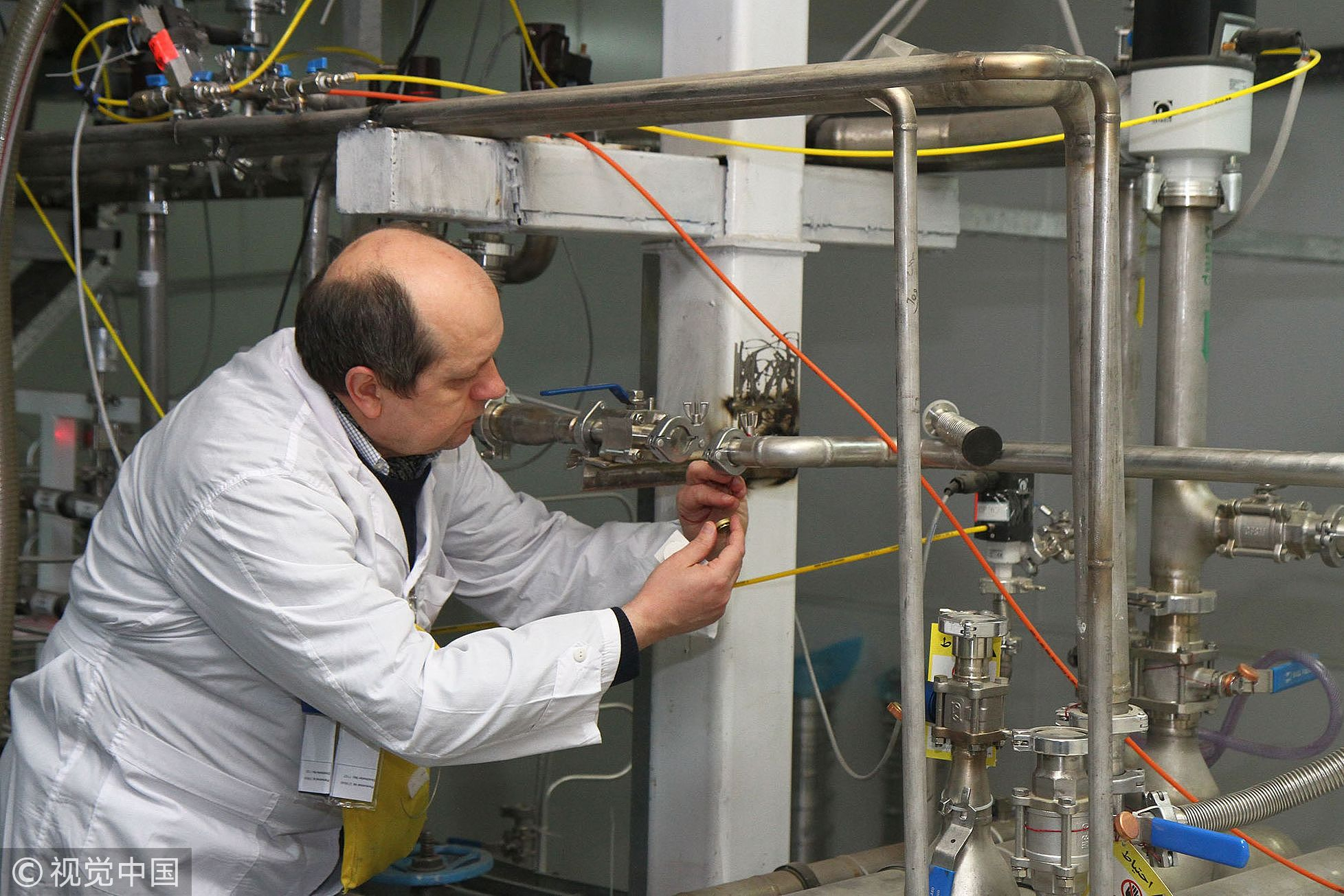 An unidentified International Atomic Energy Agency (IAEA) inspector disconnects the twin cascades for 20 percent uranium production at the nuclear power plant of Natanz, south of Tehran, Jan. 20, 2014 /VCG Photo