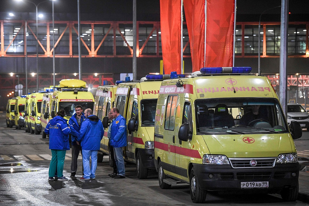 Ambulances are parked in front of the terminal building of the Sheremetyevo Airport outside Moscow after the hard landing of the Sukhoi Superjet-100, May 5, 2019. /VCG Photo