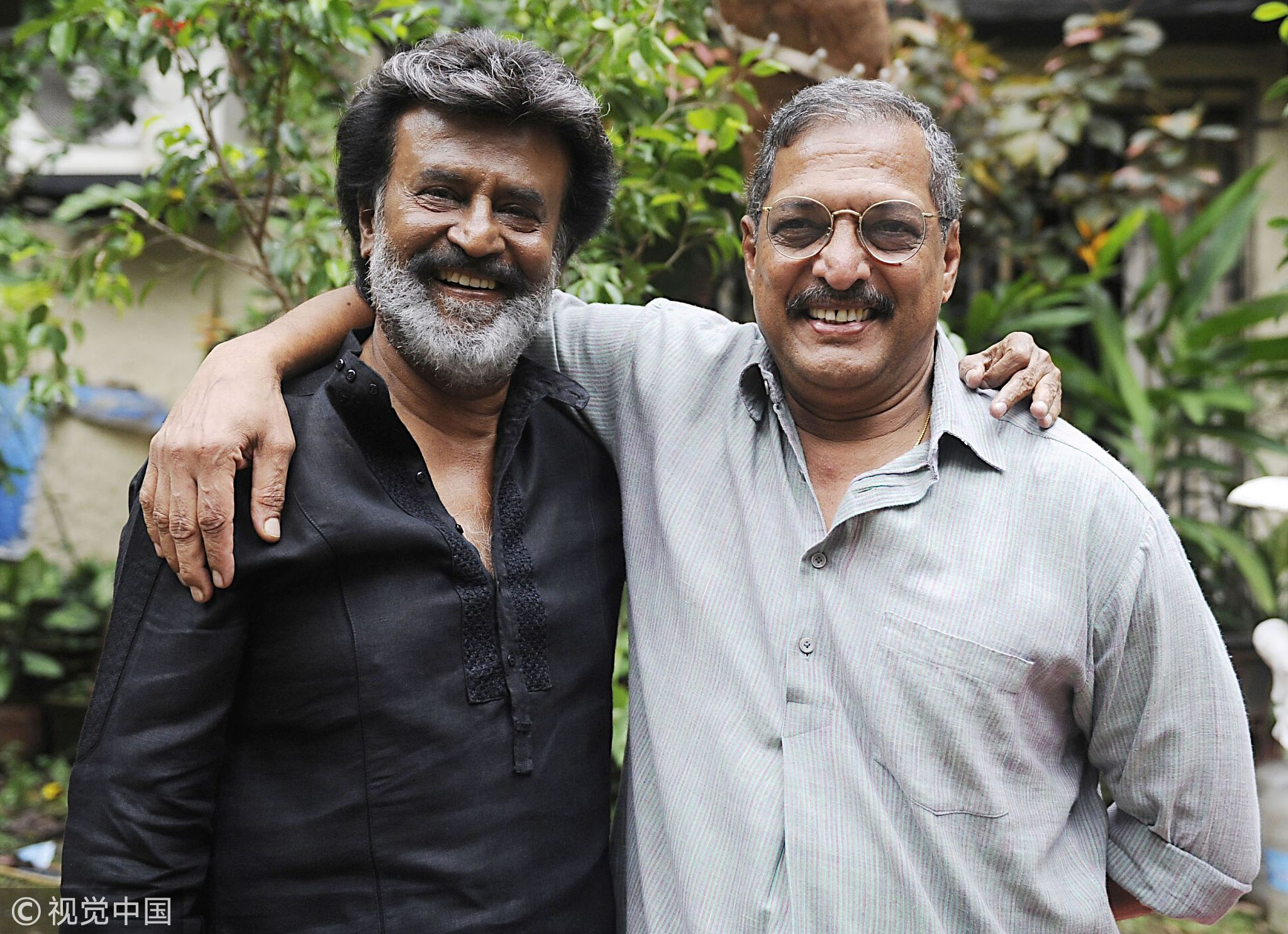 Indian Bollywood actors Rajinikanth (L) and Nana Patekar(R) pose for a photograph during the shooting of the forthcoming Tamil film 'Kaala Karikaalan' in Mumbai on June 24, 2017. /VCG Photo