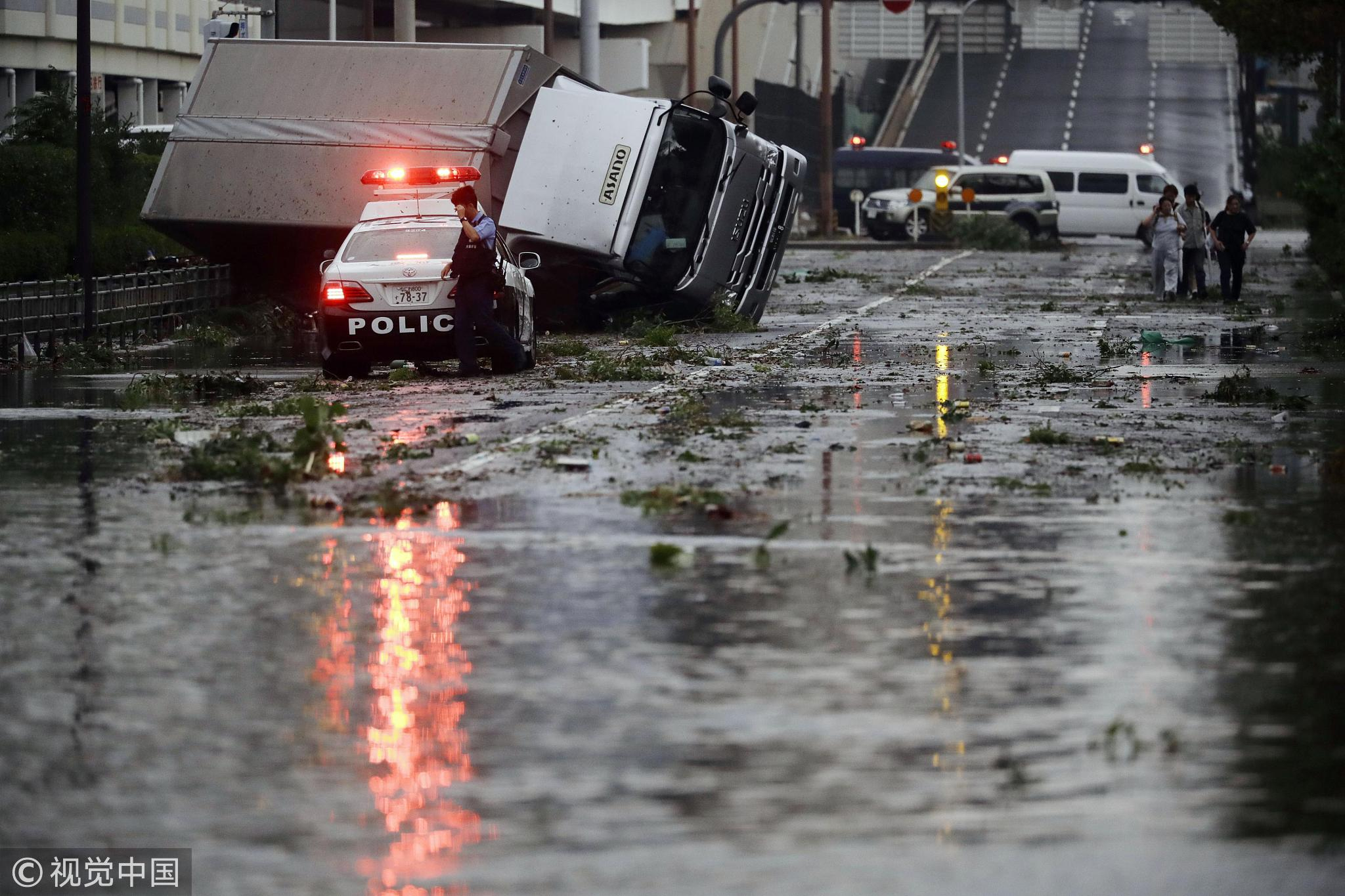 A truck is blown over on a flooded road in Osaka, September 4, 2018. /VCG Photo