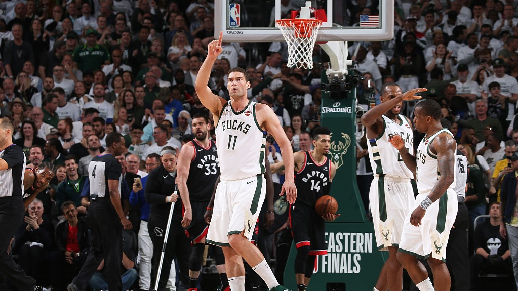 Brook Lopez #11 of the Bucks shoots a three-pointer in the game against the Raptors, May 15, 2019. /VCG Photo