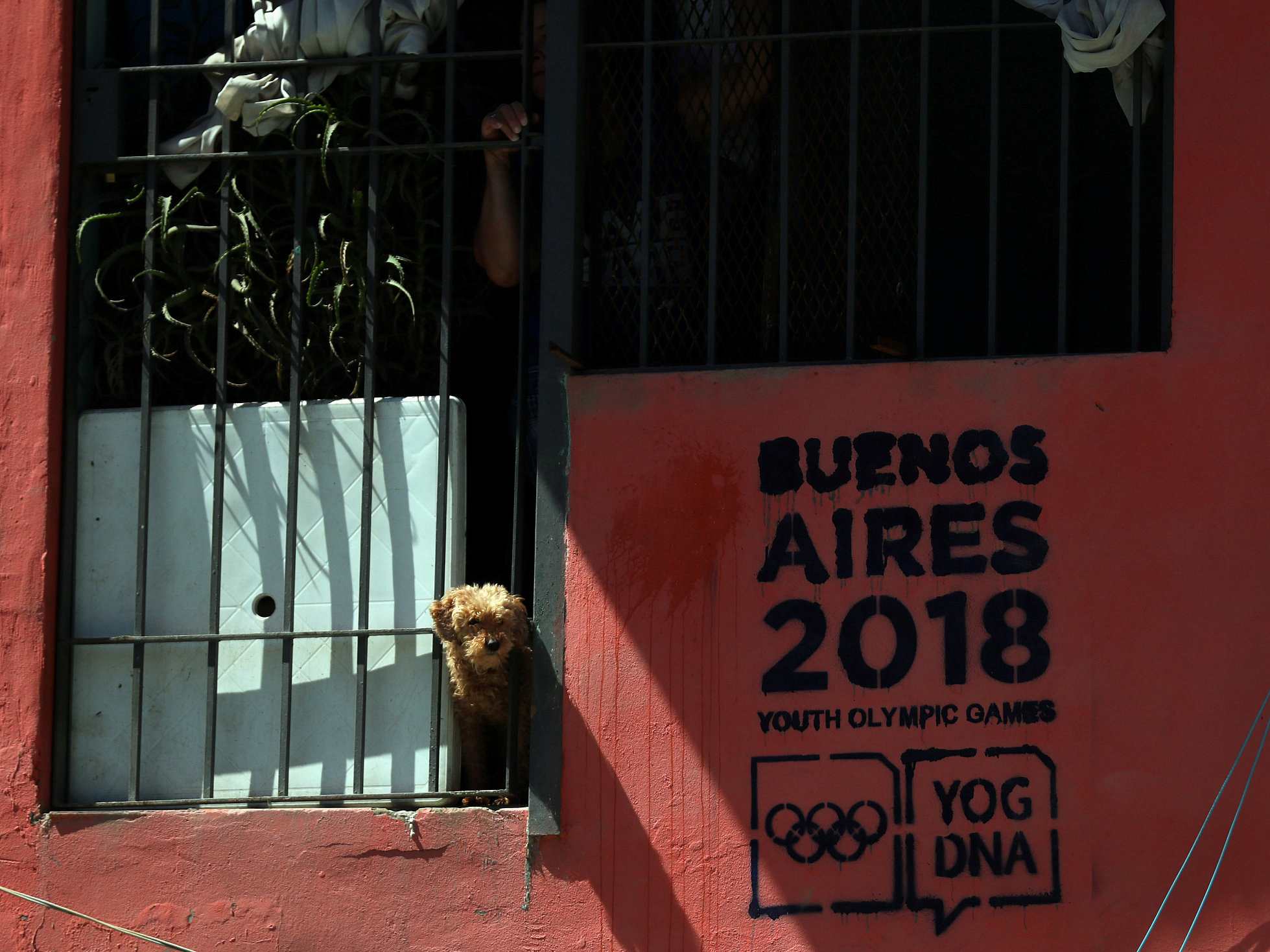 A dog and a woman are seen looking out from their home next to a graffiti advertising the Summer Youth Olympic Games in a shantytown in Buenos Aires, Argentina, October 2, 2018. /VCG Photo