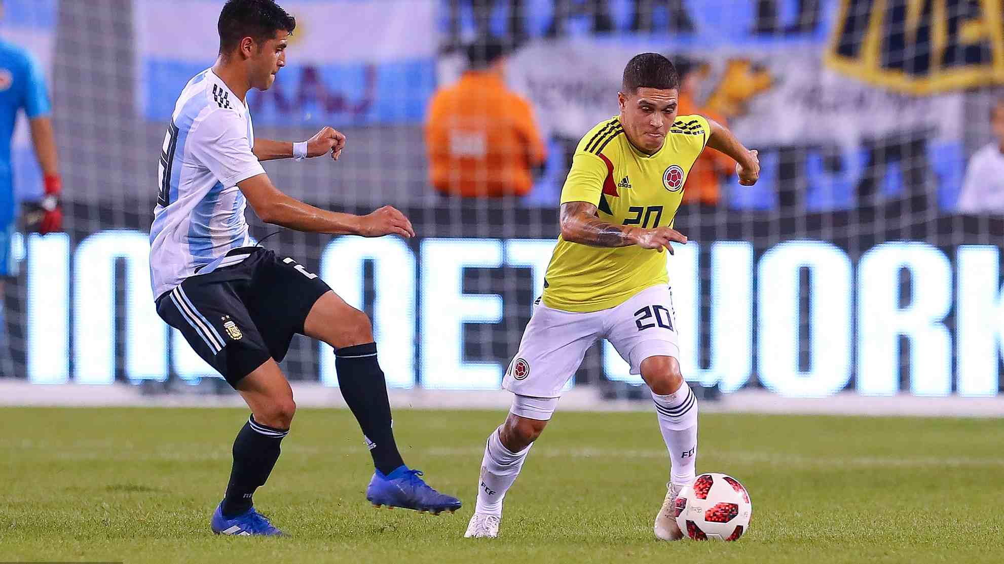 Juan Quintero (R) dribbles past Exequiel Palacios as Messi-less Argentina play out a goalless draw with Colombia, September 11, 2018. /VCG Photo