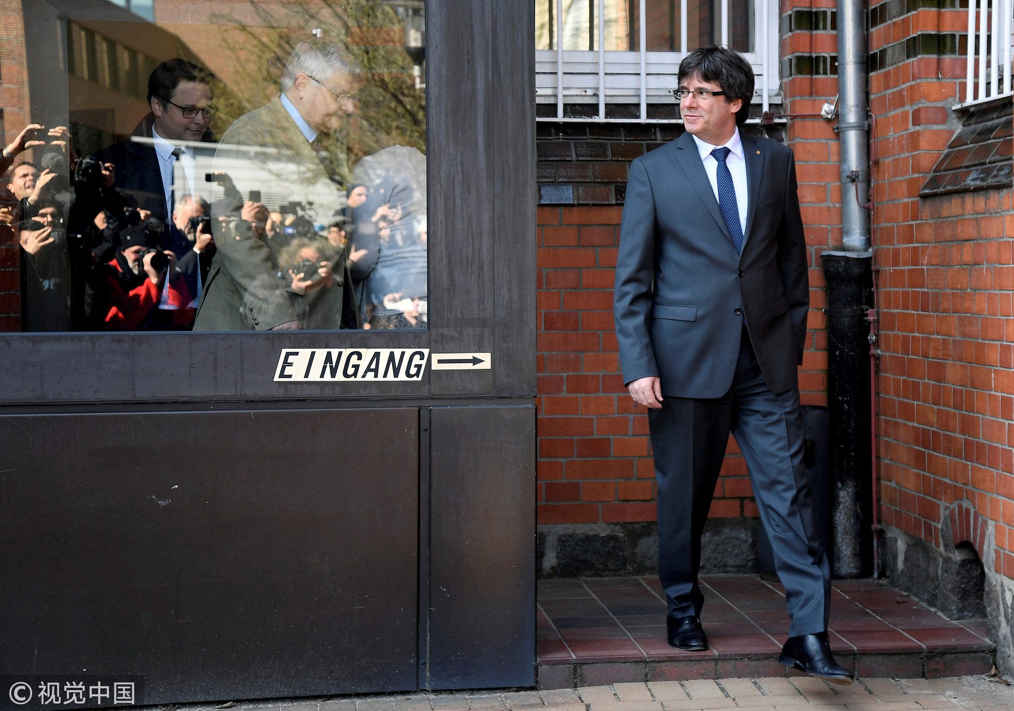 Catalonia's former leader Carles Puigdemont looks on as he leaves the prison in Neumuenster, Germany, April 6, 2018. /VCG Photo